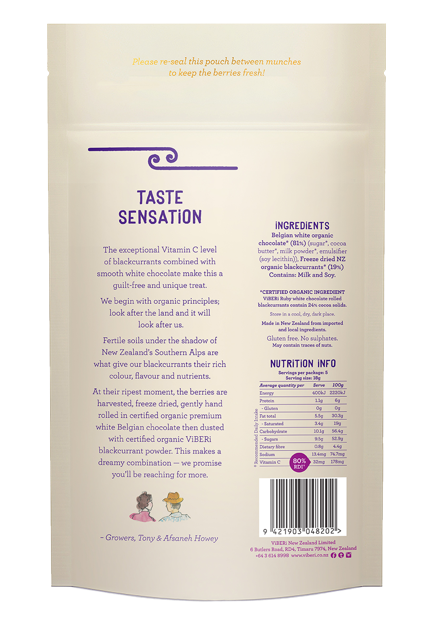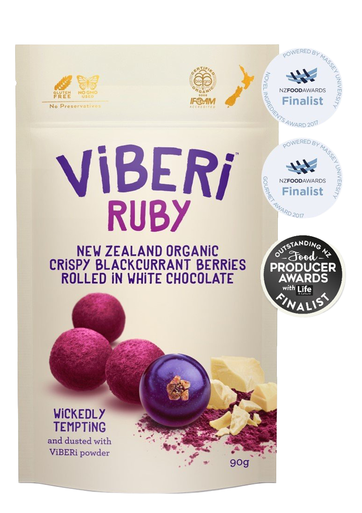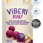 ViBERi organic crispy freeze dried blackcurrants rolled in the highest grade organic Belgian white chocolate and dusted with blackcurrant powder.